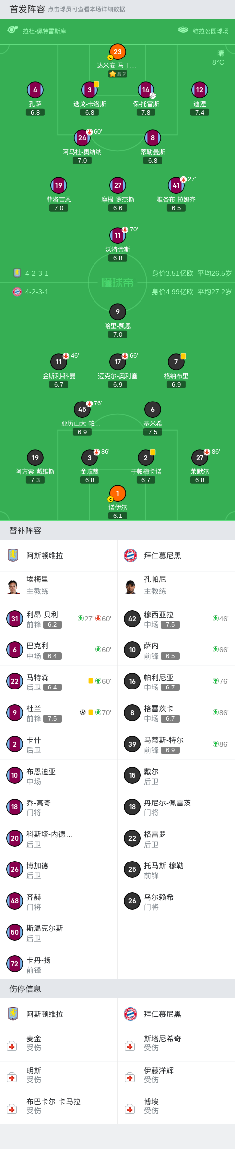 进入补时阶段的第90+4分钟,凯恩在对方禁区内头球攻门,但大马丁神勇扑出了这次致命的射门,为球队守住了胜利。全场比赛结束,阿斯顿维拉以1-0的比分击败了拜仁慕尼黑。球场上,维拉球员们振臂高呼,庆祝着这场不可思议的胜利,而拜仁队员们则黯然离场。